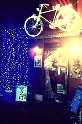 入口ドアの上の白い自転車は「夢に向かって真っすぐ走る」という意味です。