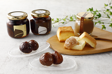 熊本県産の栗を砂糖だけで炊き上げた渋皮煮「自然栗」、「自然栗」を紅茶とブランデーに漬けこんだ大人の味わい「マロンブランテ」、国産和栗を渋皮ごとペーストにしバターと組み合わせたまろやかな「マロンバター」の3種セット。