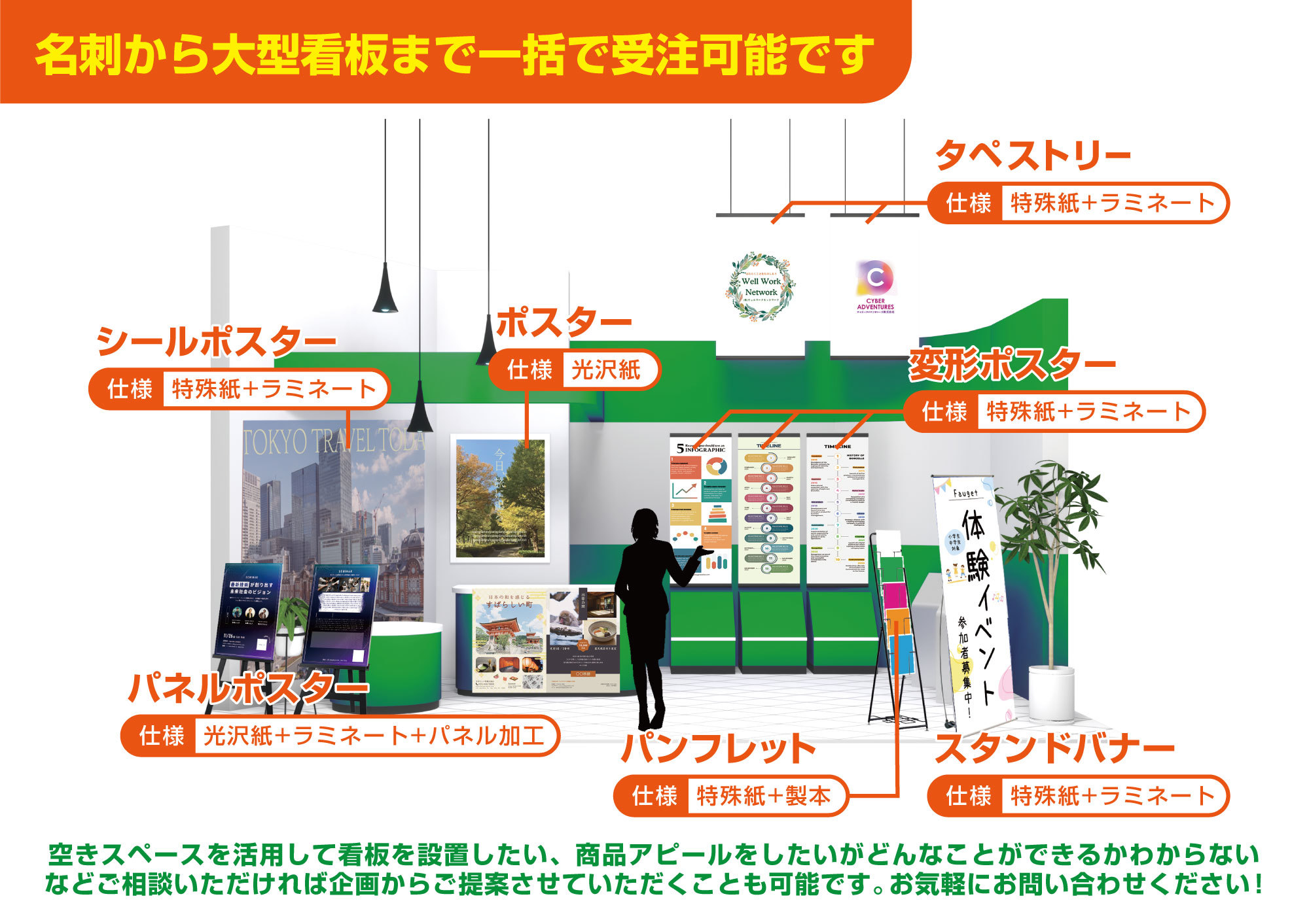 名刺などの小さなものから屋外の大型看板広告まで、1枚から対応させていただきます。店頭では様々なサンプルもご覧いただけますので、ご相談のみでも是非お気軽にお越しください。